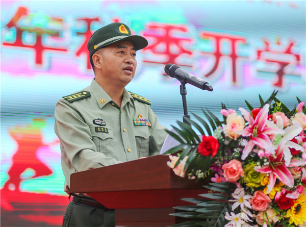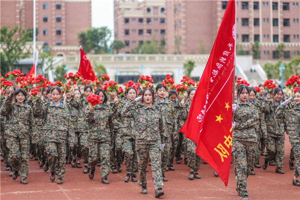 礼炮齐鸣,鲜花簇拥。在庄严的国歌声中,五星红旗在体育场冉冉升起,开学典礼暨军训汇报表演正式开始。