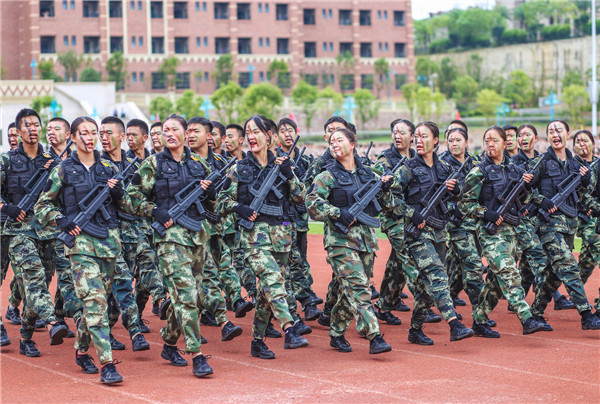 在《军体技能展示》节目中,战术训练方队、防爆应急方队等,以饱满的精神面貌,顽强的意志品质和严谨的工作作风展示了当代大学生的使命与担当。