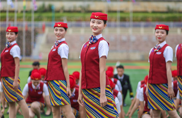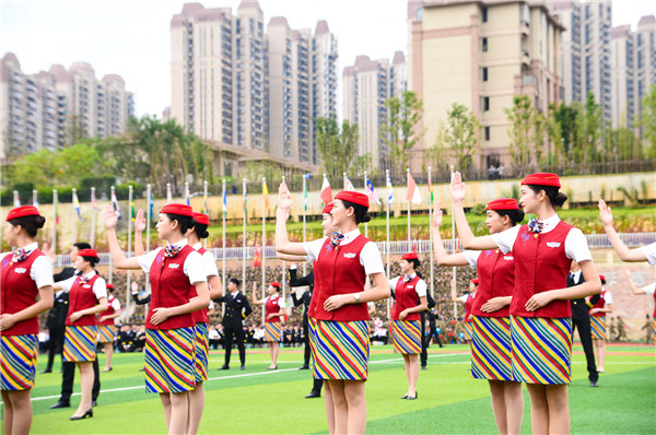 由准空姐和准空少们表演的节目《礼仪展示》展现了天府航院学子朝气蓬勃、奋发有为的精神面貌。